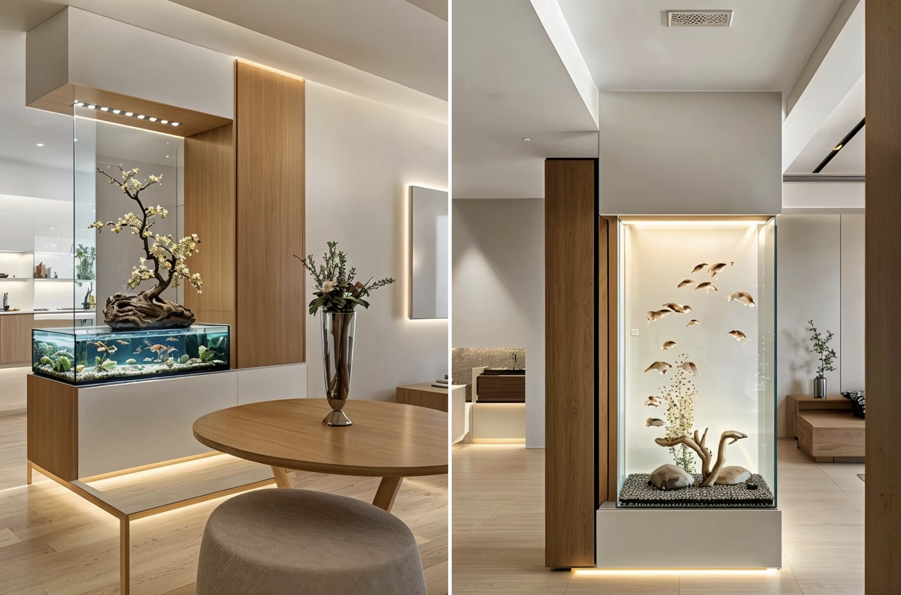 Еко-акваријум служи као фокусна тачка, додајући разиграни и динамични додир кући.