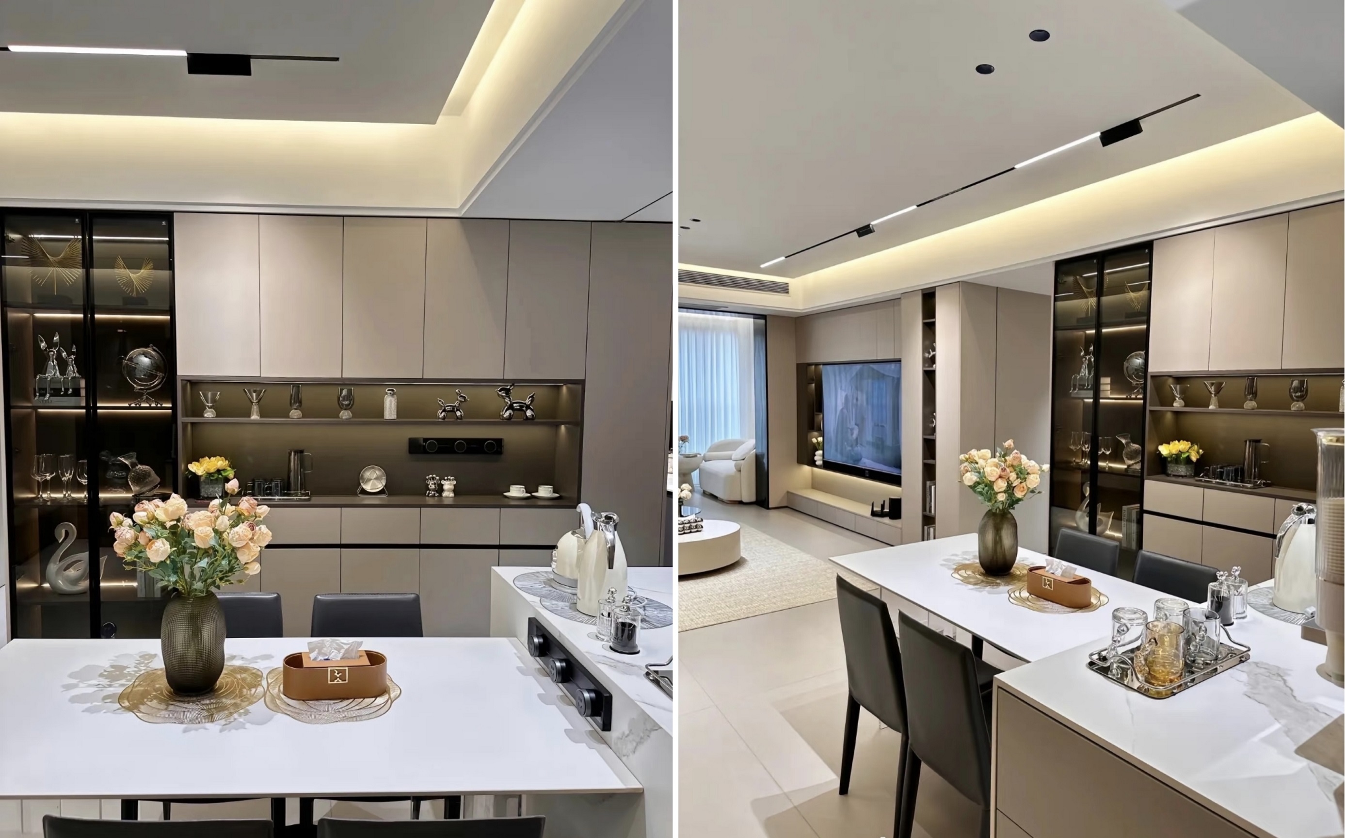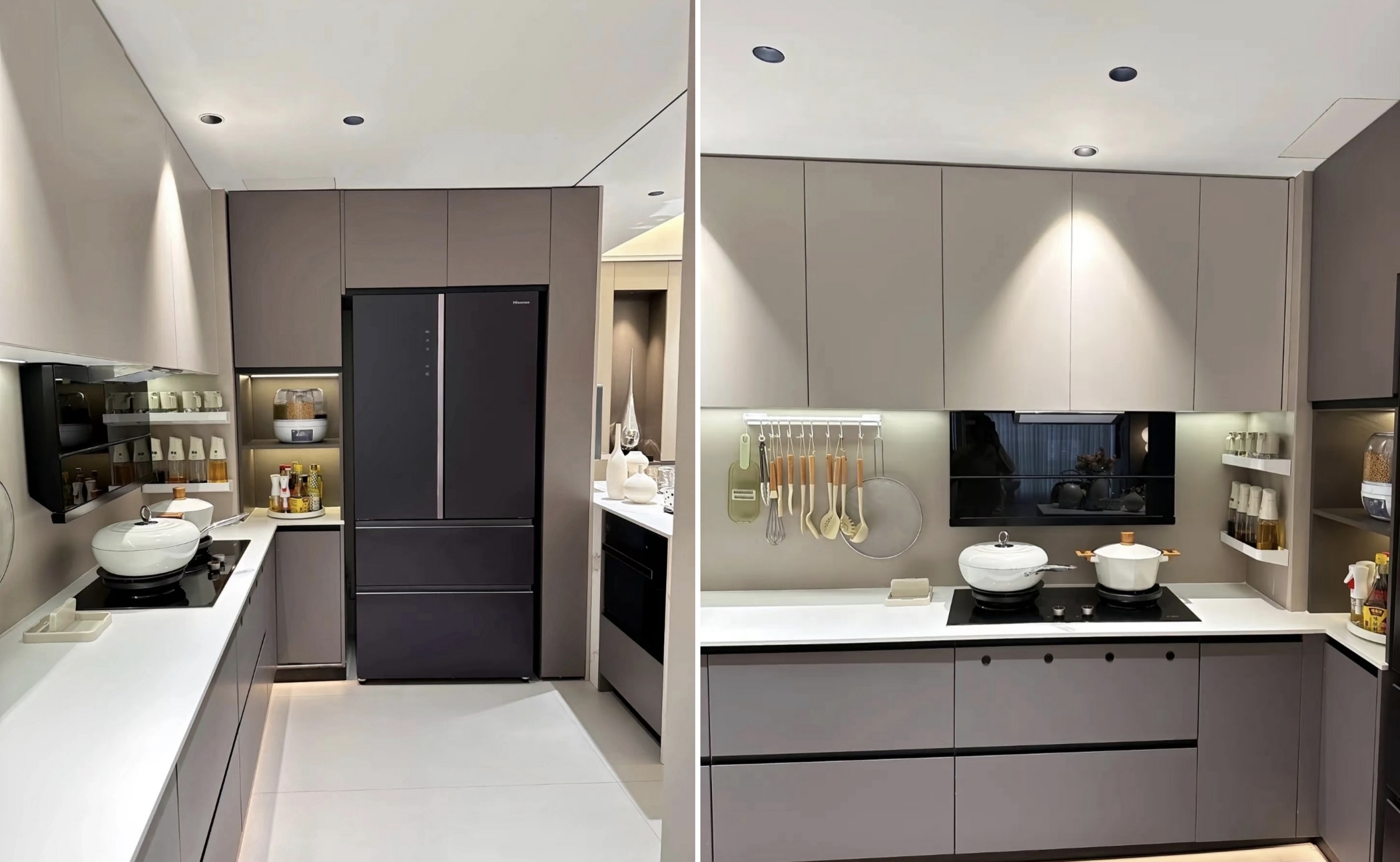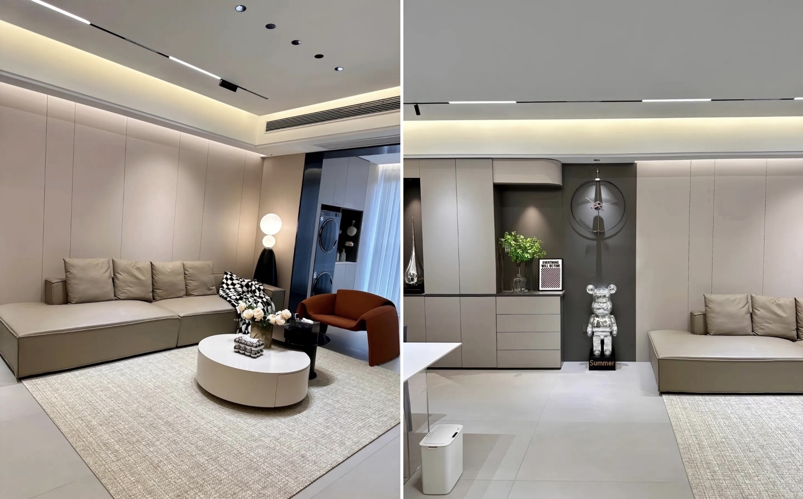 1. Цела кућа је поплочена са 1500 * 750 топлих сивих мат плочица, користећи исту боју песка епоксидне боје, без икаквог прага, чинећи простор транспарентнијима.